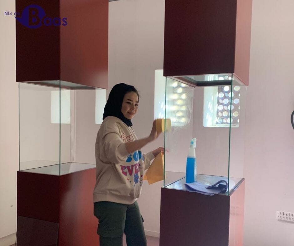 Met 10 man aan de slag betekent 10 emmers, 10 ragebollen, 10 bezems, 10 sponzen en 2 stofzuigers.